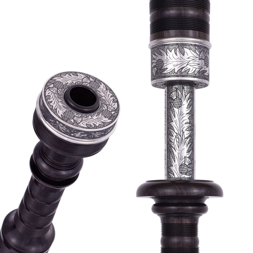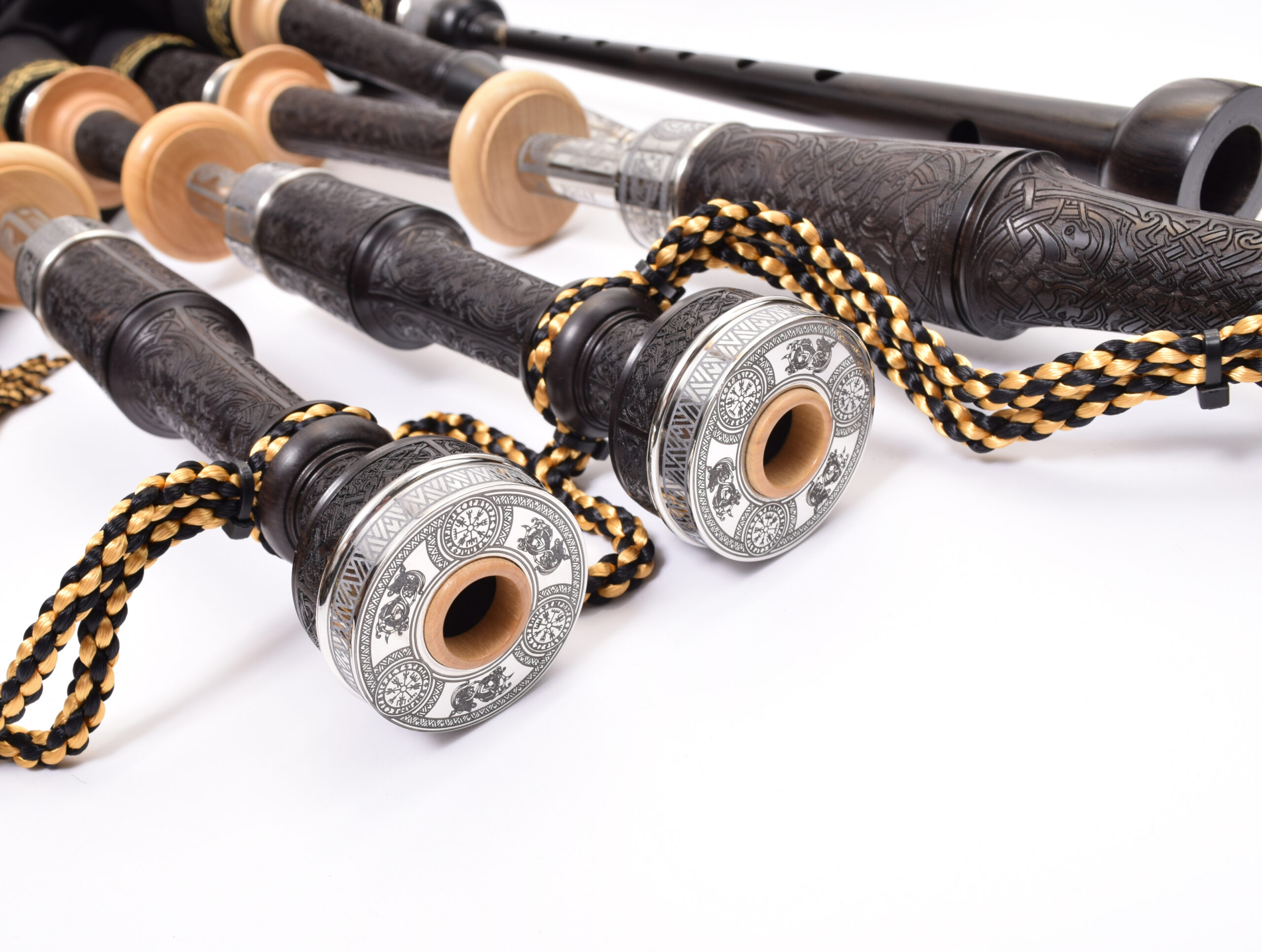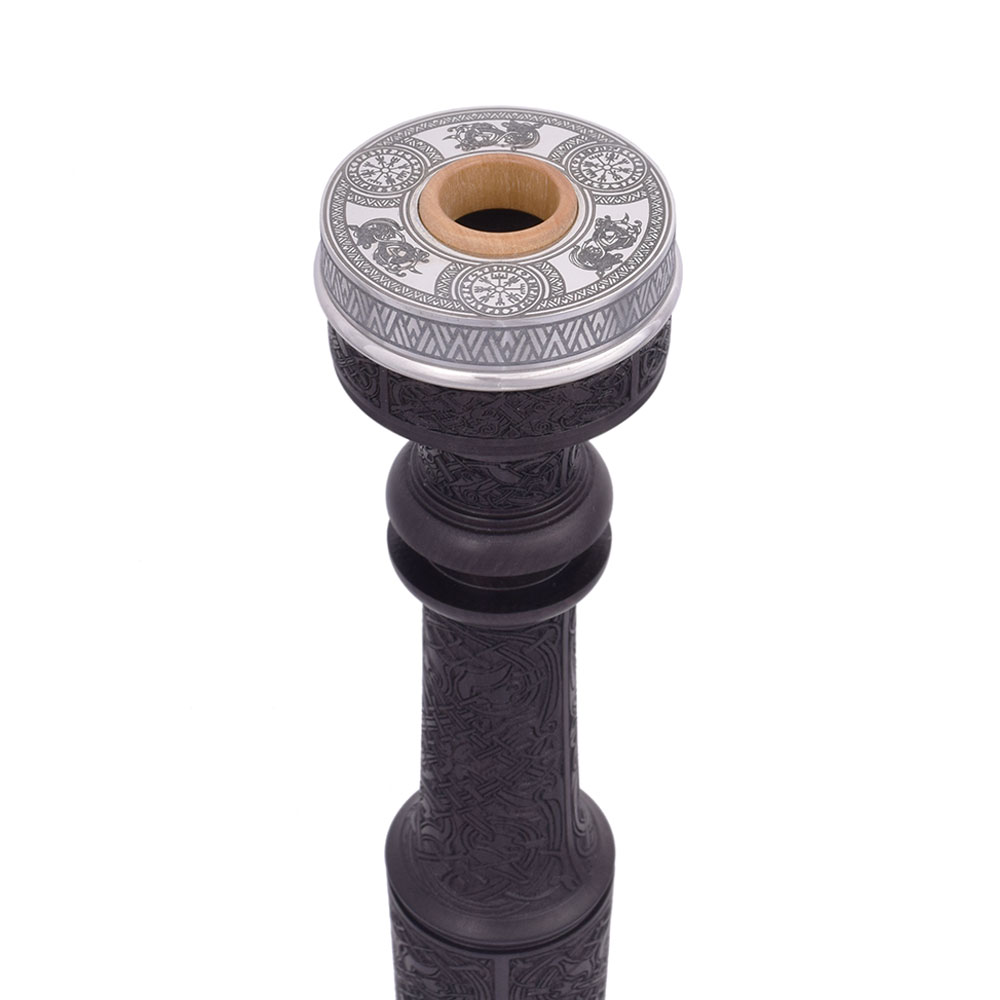 Crafted with exceptional attention to detail, this distinctive set of Heritage Bagpipes features laser-engraved Viking nickel and finely detailed woodwork inspired by Viking artistry.