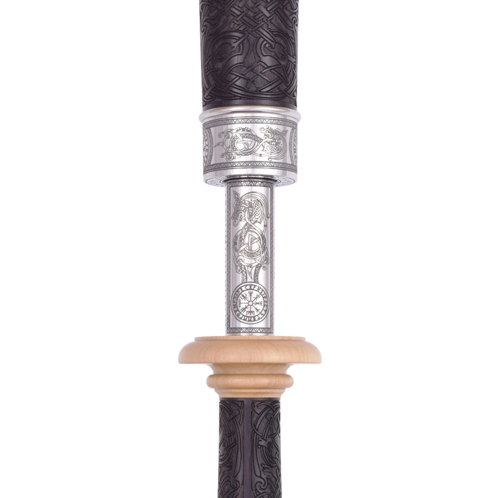 The engraving includes a Vegvisir (Viking Compass), seamlessly integrated with Viking patterns and a custom-designed dragon motif, symbolising the bow of a Viking longship. Runic inscriptions for “Peter Henderson”, “Heritage,” and “Viking” are also featured, along with hidden bind runes symbolising Courage, Protection, Music, Friendship, and Good Luck.